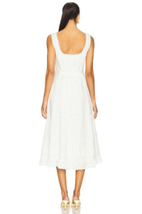 - 100% cotton - Hand wash - Fully lined - Hidden side zipper closure - Front faux button accent - Back tie-up design - Poplin fabric with tonal floral accents and ruffle hem - Revolve Style No. DGUI-WD99 - Manufacturer Style No. P25406W155