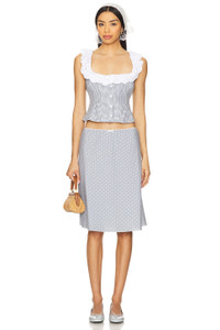- Self: 58% polyester 36% rayon 6% nylon Lining: 100% polyester - Hand wash - Fully lined - Pull-on styling - Scalloped lace waistband trim with front bow accent - Midweight crepe fabric - Item not sold as a set - Skirt measures approx 22" in length - Revolve Style No. DGUI-WQ95 - Manufacturer Style No. S25338W152