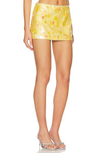 - Self: 90% polyester 10% elastane Lining: 95% polyester 5% elastane - Made in China - Spot clean only - Fully lined - Hidden side zipper closure - Sequin and paillette embellishments throughout - Skirt measures approx 10.5" in length - Revolve Style No. DGUI-WQ65 - Manufacturer Style No. S24336