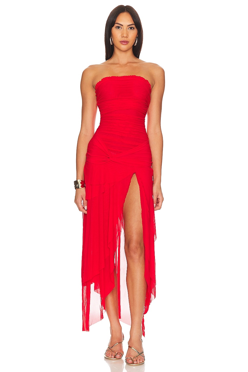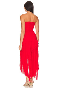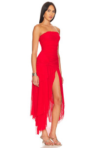 - 90% nylon 10% spandex - Made in China - Hand wash - Double lined - Hidden side zipper closure - Side seam slit - Ruched mesh fabric with handkerchief hem - Neckline to shortest hem measures approx 41" and to longest hem approx 50" in length - Revolve Style No. DGUI-WD57 - Manufacturer Style No. R24414