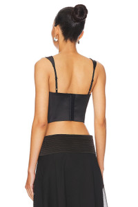 - Self: 97% polyester 3% spandex Self 2: 55% viscose 45% rayon Lining: 97% polyester 3% spandex - Made in China - Dry clean only - Back hook and eye closure - Unpadded underwire cups - Boned bodice - Drawstring with tie closure at neckline - Adjustable shoulder straps - Revolve Style No. DGUI-WS137 - Manufacturer Style No. S24110