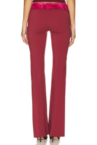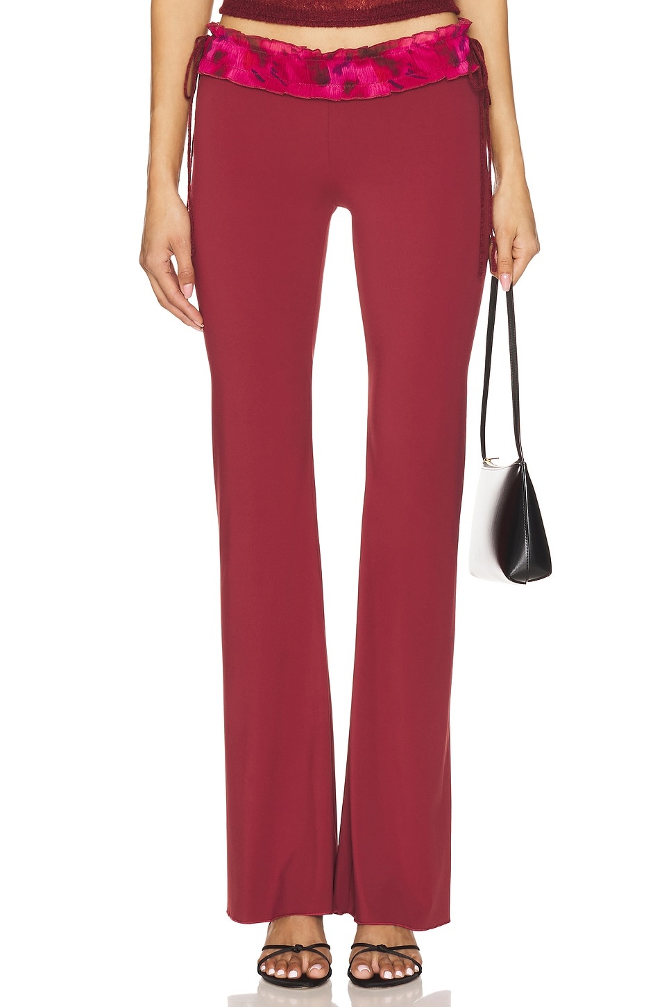 - 75% nylon 25% elastane - Dry clean only - Pull-on styling - Adjustable side tie closures - Ruffle waistband trim - Midweight slinky jersey fabric - Item not sold as a set.14" at the knee breaks to 18.5" at the leg opening - Revolve Style No. DGUI-WP35 - Manufacturer Style No. S25209K019