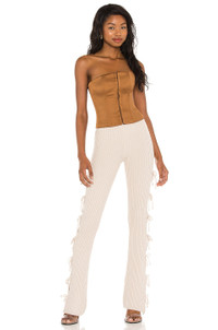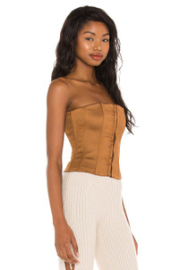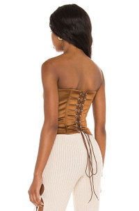- Shell: 97% polyester 3% spandex Lining: 97% polyester 3% spandex - Made in China - Dry clean only - Front hook and eye closure - Corset back with tie closure - Boned bodice - Sheen satin fabric - Revolve Style No. DGUI-WS39 - Manufacturer Style No. C00105W037