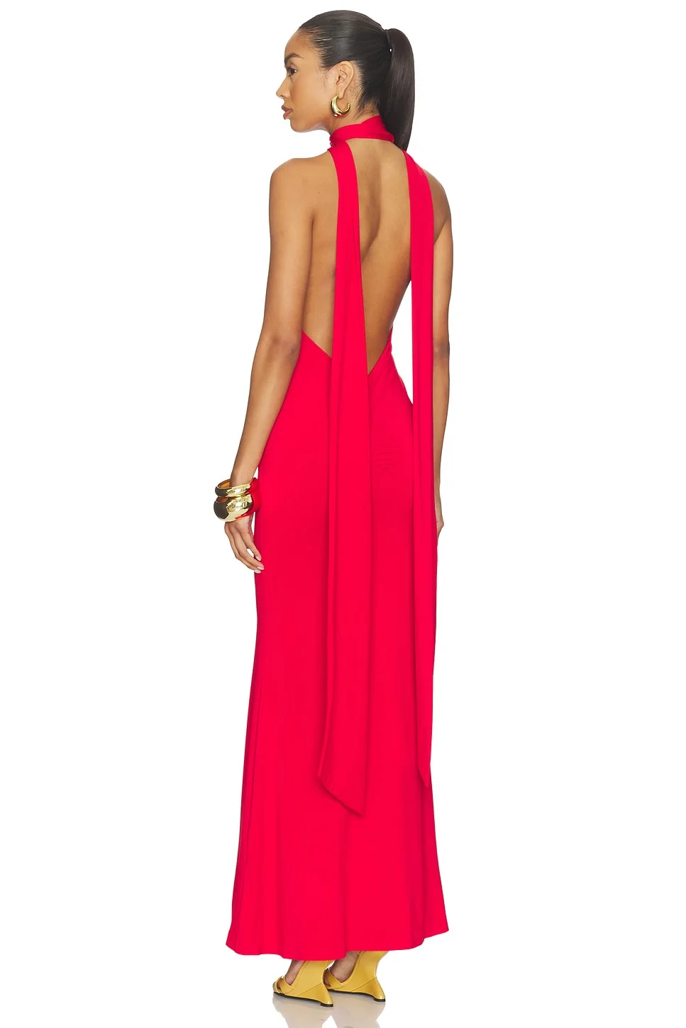 - 92% polyester, 8% spandex - Made in China - Hand wash cold - Fully lined - Slip-on styling - Stretchable fabric - Halter-style gown with an open back and floor-length silhouette - Revolve Style No. DGUI-WD117 - Manufacturer Style No. H25430K012