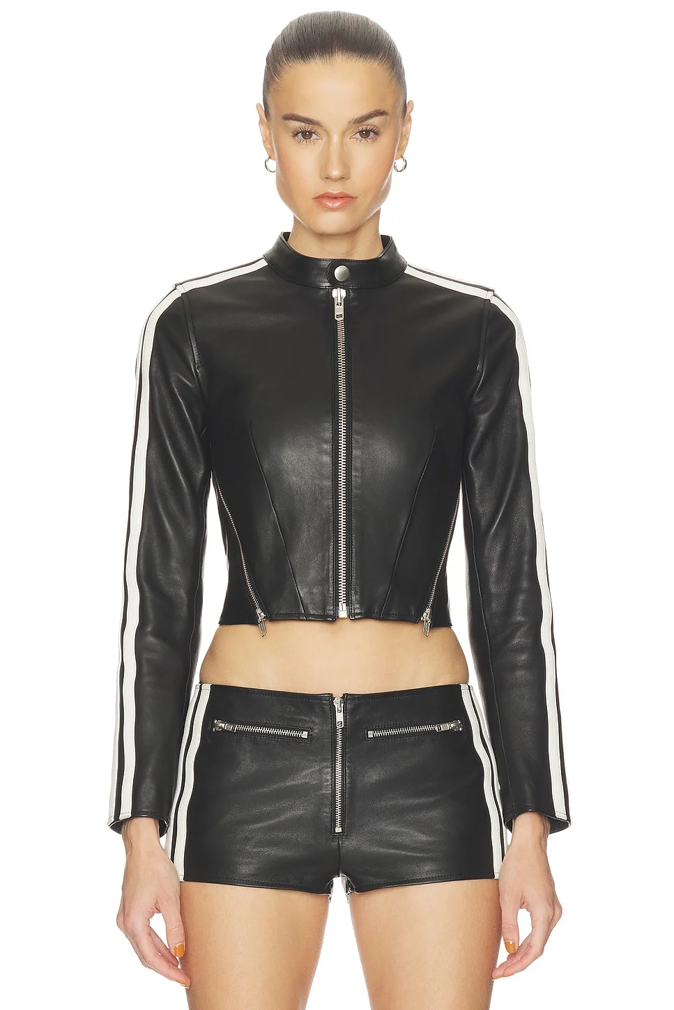 - In 100% lambskin leather, this is your classic moto-inspired jacket with a sporty twist - The snap collar and zips at the front and side are an added bonus for day to night looks - .Self: 100% lamb leather Lining: 100% polyester - Professional leather clean only - Front zip with snap button closure - Front zip detailing - Cropped fit - Heavyweight leather fabric - Item not sold as a set - Revolve Style No. HELO-WO7 - Manufacturer Style No. HAOW10006 S26