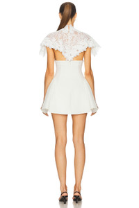 - Self 1: 60% naia™ acetate 40% recycled polyester Self 2: 55% cotton 24% nylon 21% viscose Self 3: 89% polyester 11% elastane Lining: 100% nylon - Dry clean only - Partially lined - Back hook and eye clasp closure with keyhole design Hidden back zipper closure - Sleeveless design with attached lace overlay at shoulders - Crepe and lace fabric with fit and flare styling - Revolve Style No. HLSA-WD215 - Manufacturer Style No. HED10011 U25