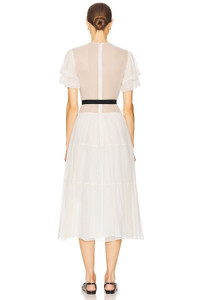 - Self: 100% silk Lining: 100% polyester - Dry clean only - Partially lined - Hidden back zipper closure - Removable bow detail at waist - Chiffon fabric - Garment is made with a semi-sheer fabric, undergarments can show through - Revolve Style No. HLSA-WD207 - Manufacturer Style No. HED183 U25