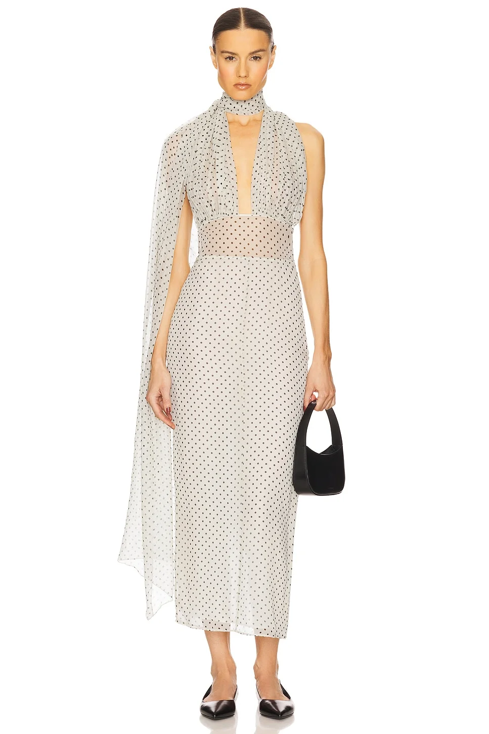 - Self: 100% silk Lining: 100% polyester - Dry clean only - Partially lined - Halterneck tie-up closure with extended fabric detail Hidden side zipper closure - Open back - Plunging front neckline - Chiffon fabric - Revolve Style No. HLSA-WD208 - Manufacturer Style No. HED184 U25