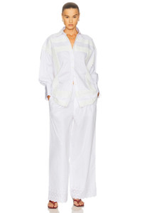 - 100% cotton - Hand wash - Elasticized waistband with drawstring closure - Side slit pockets - Singular back pouch pocket - Poplin fabric with eyelet detail at hem - Item not sold as a set.26" at the knee and narrows to 23" at the leg opening - Revolve Style No. HLSA-WP77 - Manufacturer Style No. HEP10003 U25