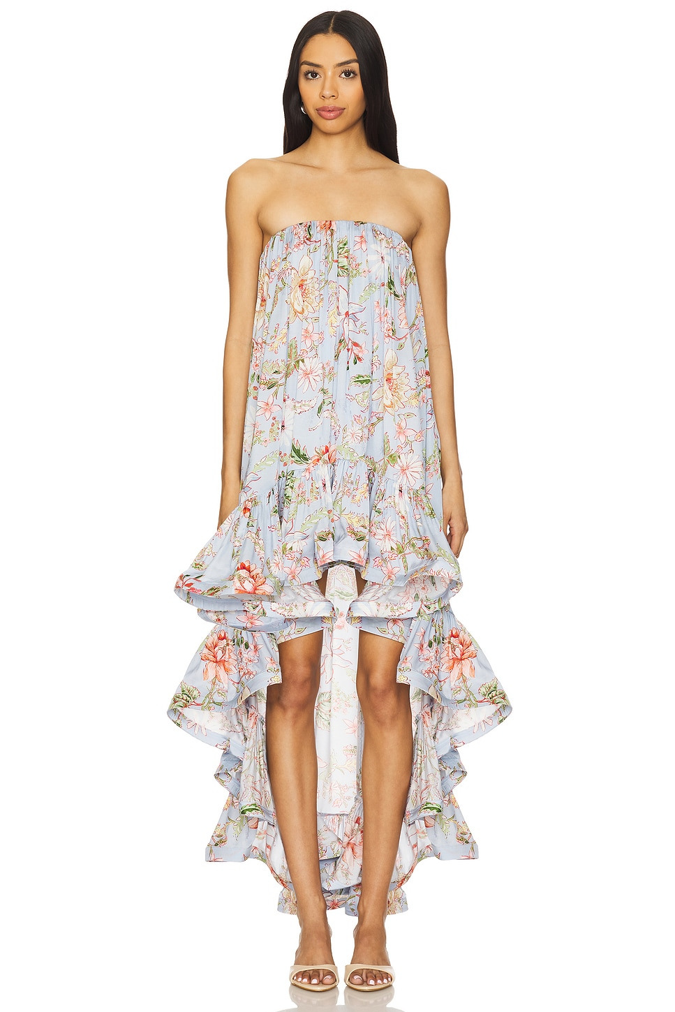 - 100% viscose - Dry clean only - Partially lined - Hidden side zipper closure - Midweight satin fabric with asymmetric hem - Neckline to shortest hem measures approx 24" and to longest hem approx 48" in length - Revolve Style No. BENE-WD376 - Manufacturer Style No. HN-NERA-SBU-5775