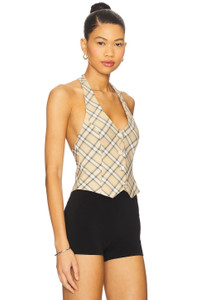 - 87% polyester 10% viscose 3% elastane - Machine wash cold - Loop button halterneck closures and dual back tie closures - Open back - Midweight twill fabric - Revolve Style No. HNNR-WS21 - Manufacturer Style No. VOL25140