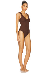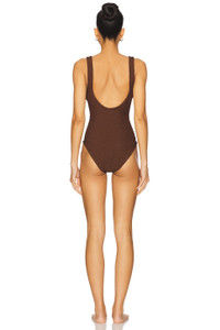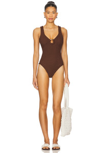- 97% polyamide 3% elastane - Machine wash cold - Unpadded cups - Circular resin accent - Smocked fabric - Midweight jersey swimwear fabric - Revolve Style No. HUNG-WX242 - Manufacturer Style No. CELINE