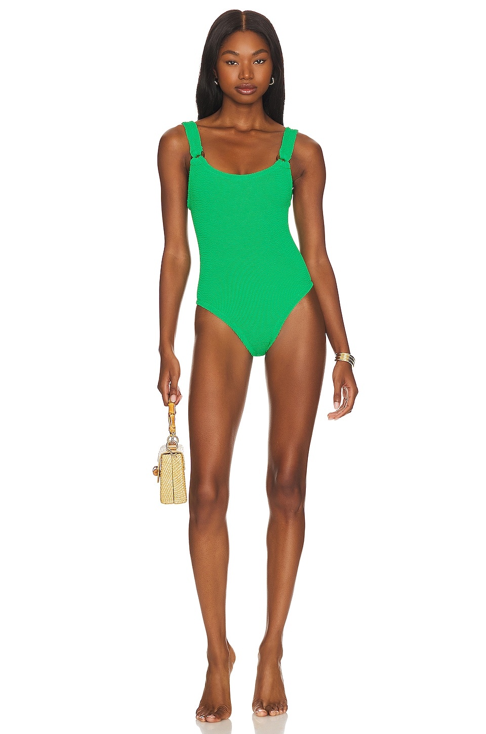- 88% nylon 12% lycra elastane - Made in England - Hand wash - Unpadded - Acrylic ring accents at shoulder straps - Scoop back Smocked fabric - Noughties tortoiseshell accents, a dipped neck silhouette, and a low scooped back rule the beach in this iconic, vibrant green swimsuit. - Revolve Style No. HUNG-WX132 - Manufacturer Style No. DOMINO SWIM