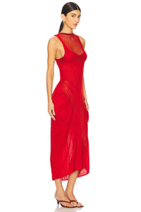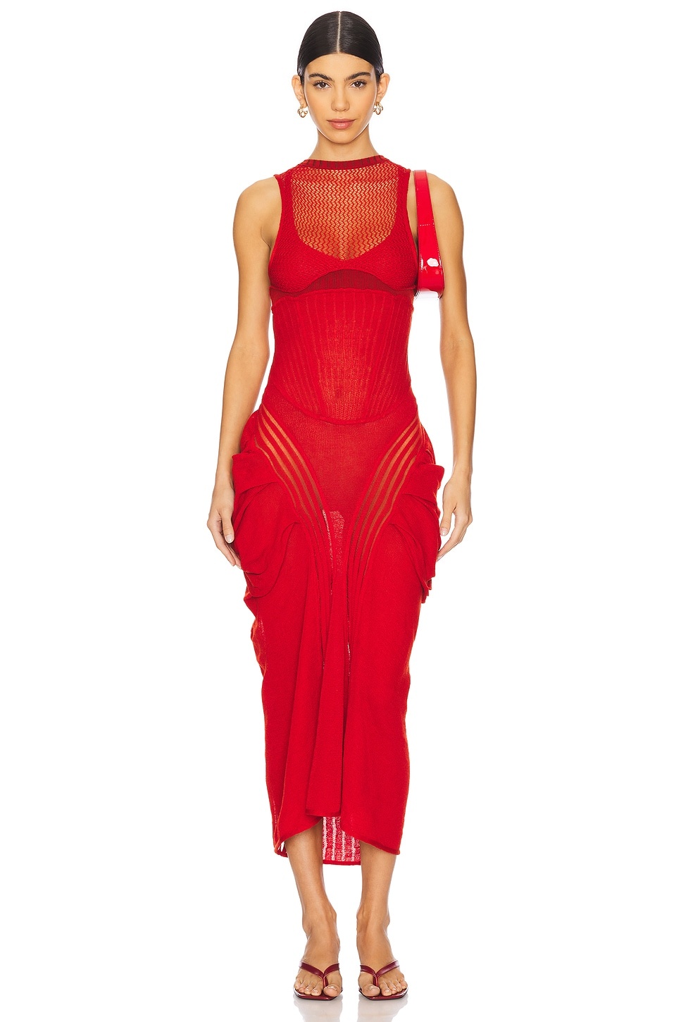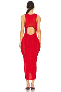 - 100% rayon - Hand wash - Unlined - Pull-on styling - back cut-out and fraped fabric accent at hips - Lightweight knit fabric - Garment is made with a semi-sheer fabric, undergarments can show through - Revolve Style No. IBOU-WD2 - Manufacturer Style No. SS25 WDR01