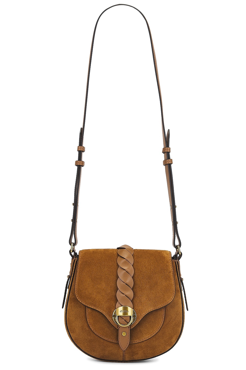 - Suede exterior with leather trim and twill lining - Flap top with magnetic button closure, braided leather detail, and gold-tone hardware - One main compartment - Interior leather card slot - Back slip pocket - Detachable and adjustable leather shoulder strap - Measures approx 8.75" W x 7" H x 2.25" D Shoulder strap with a 18.5" drop - Revolve Style No. IMAR-WY218 - Manufacturer Style No. BF0099FA-C2C21M