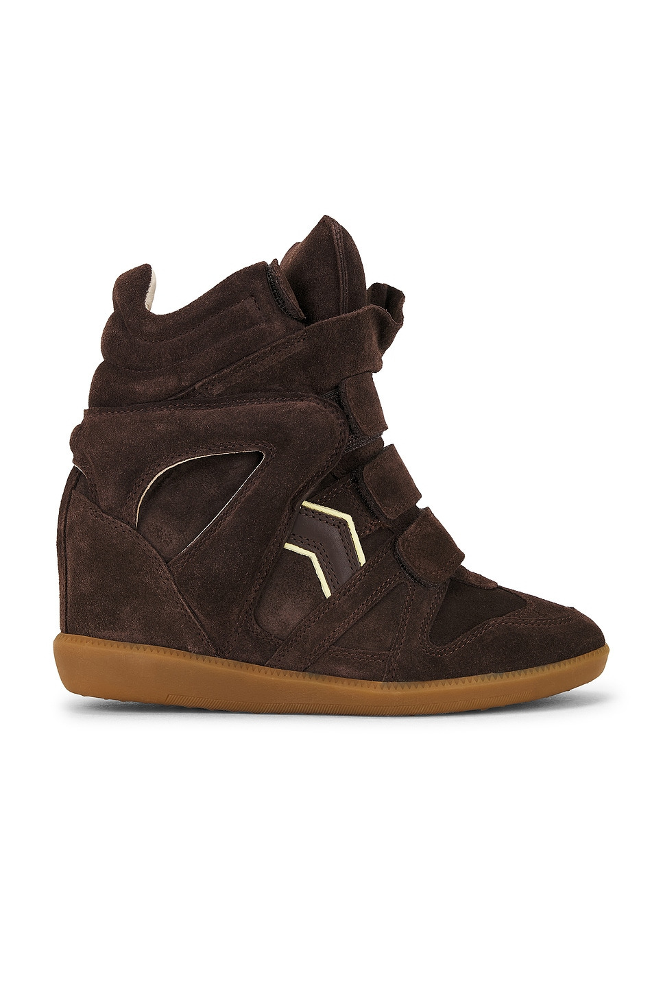 - Suede and leather upper with rubber gum sole - Velcro strap closures - Cushioned leather footbed and lining - Padded tongue with ruffle detailing - Rounded toe - Approx 65mm/ 2.5 inch wedge Approx 25mm/ 1 inch platform - Revolve Style No. IMAR-WZ413 - Manufacturer Style No. BK0010FA-C1E02S