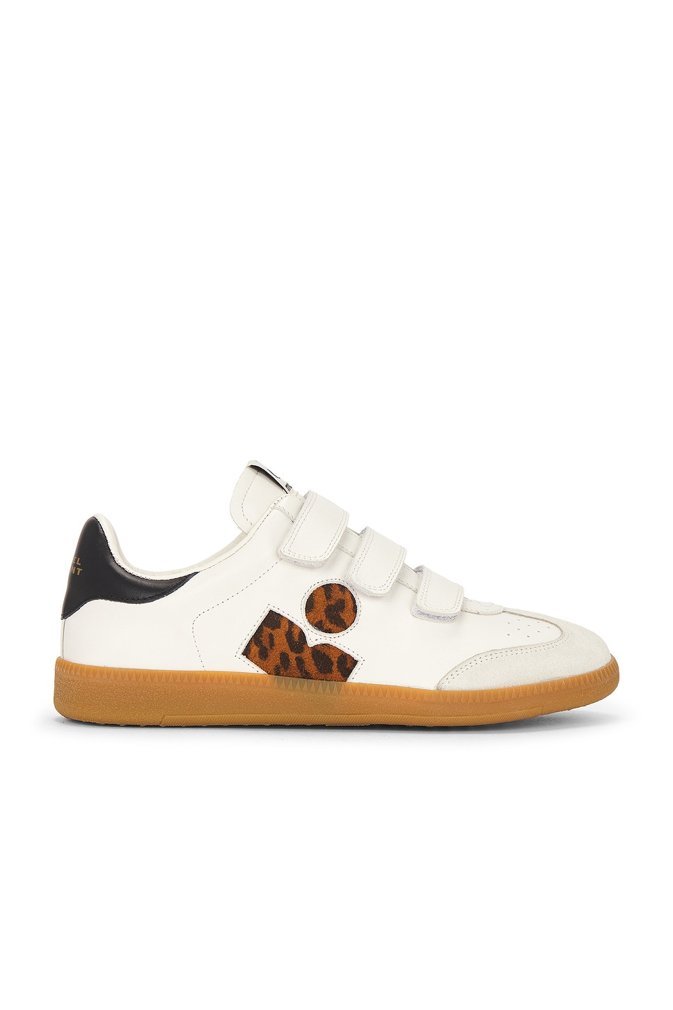 - Leather upper with suede trim and rubber gum sole - Three velcro straps at front - Leopard printed suede Marant logo at outer panels - Isabel Marant logo patch at tongue - Light perforations at toe - Padded low-cut collar with printed Isabel Marant logo at back counter - Revolve Style No. IMAR-WZ380 - Manufacturer Style No. BK0013FA-C3E07S