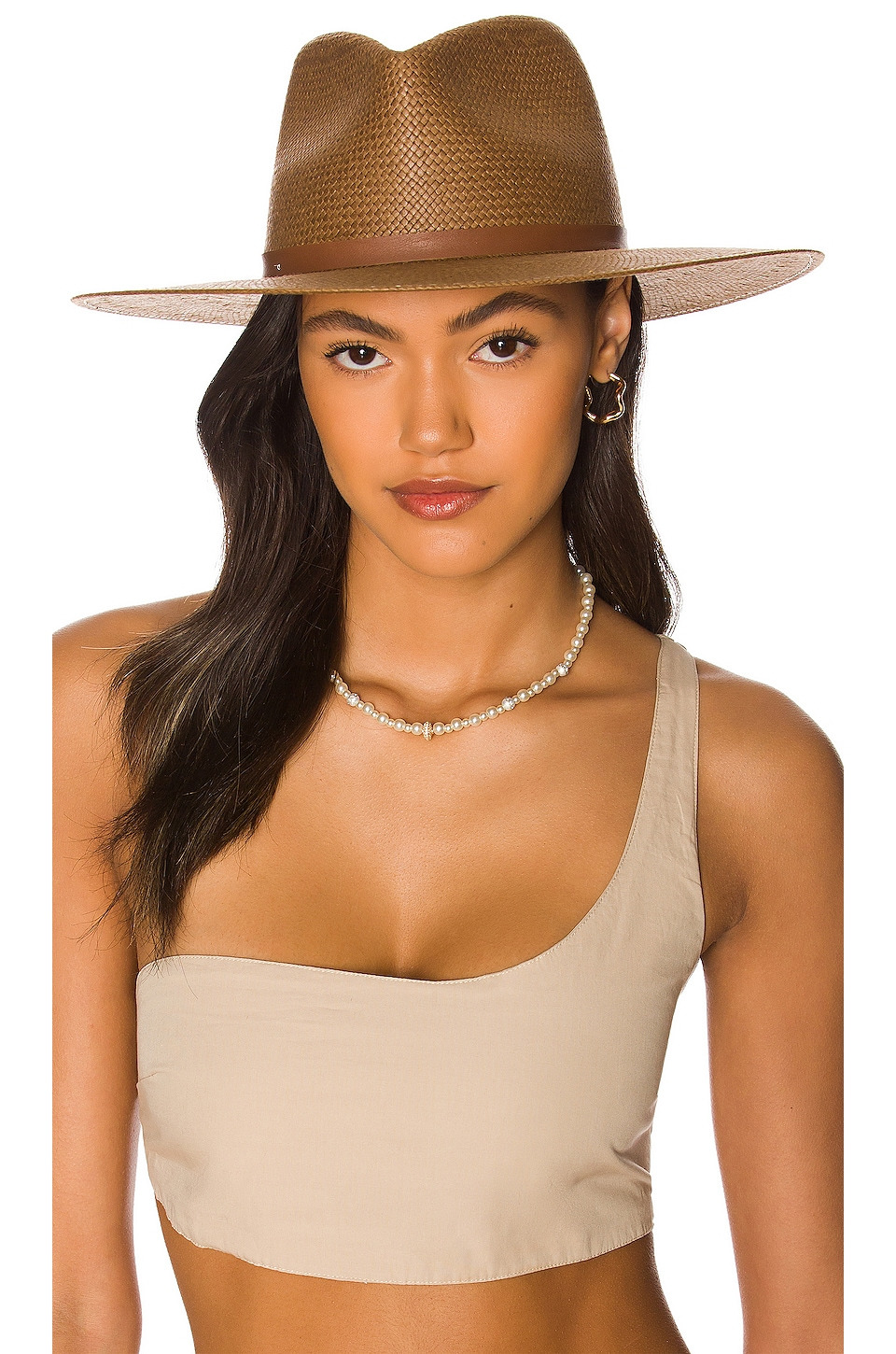 - 100% straw - Made in USA - Tonal leather accent strap - Interior band lining - Brim measures approx 3.5" in length - Revolve Style No. JNES-WA97 - Manufacturer Style No. SS22014