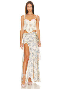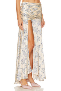 - 100% silk - Made in China - Dry clean only - Unlined - Hidden side zipper closure - Pleated waist - Charmeuse fabric with side slit - Waist to shortest hem measures approx 9.5" and to longest hem approx 44.5" in length - Revolve Style No. KIMR-WQ20 - Manufacturer Style No. KS2023FW46