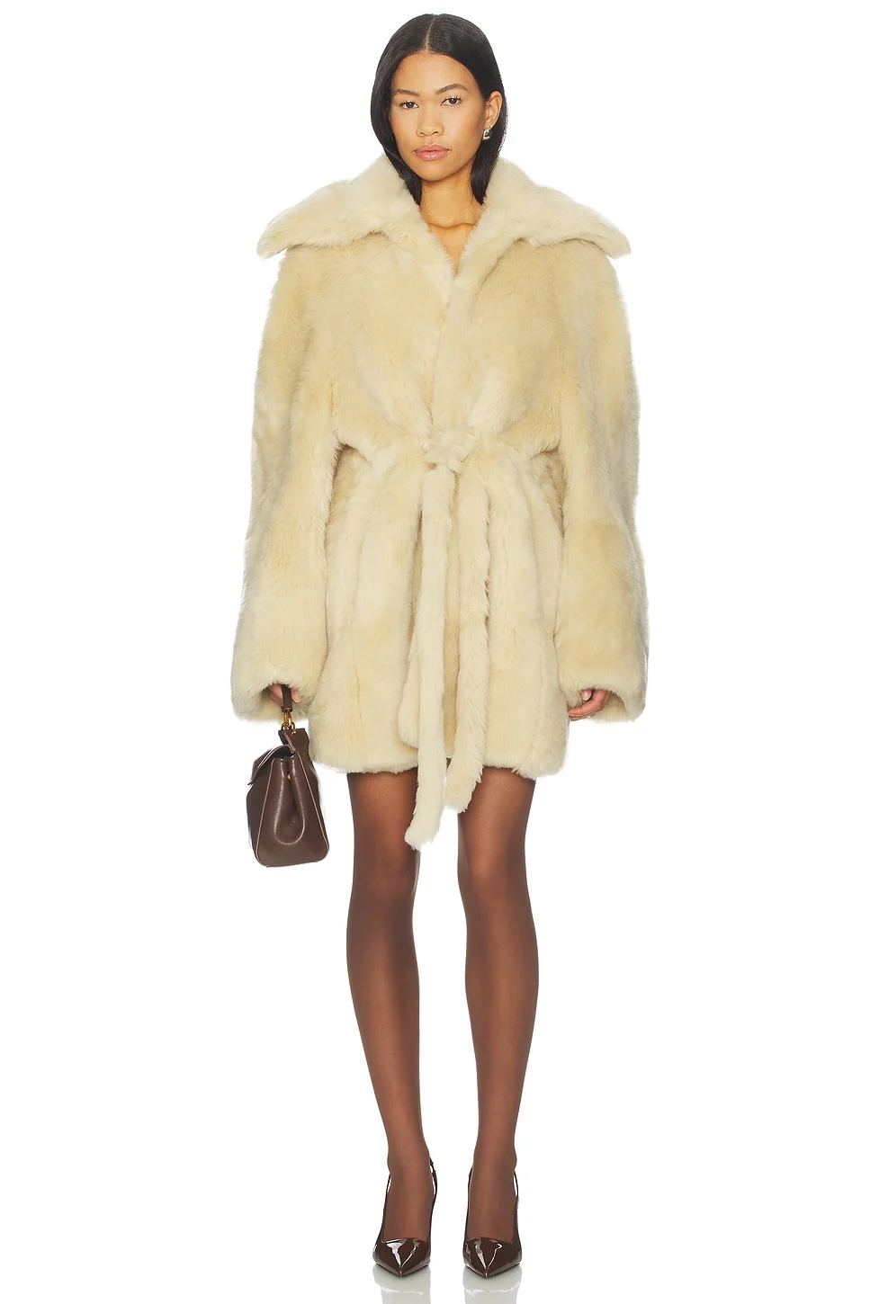 - Self: 100% dyed lamb shearling Lining: 100% acetate - Made in Turkey Fur Origin: Turkey - Specialized dry clean only - Hidden front hook closure - Attached waist tie - Genuine shearling - Hidden side seam pockets - Revolve Style No. KNLR-WO5 - Manufacturer Style No. AW25-BABYC0BLO