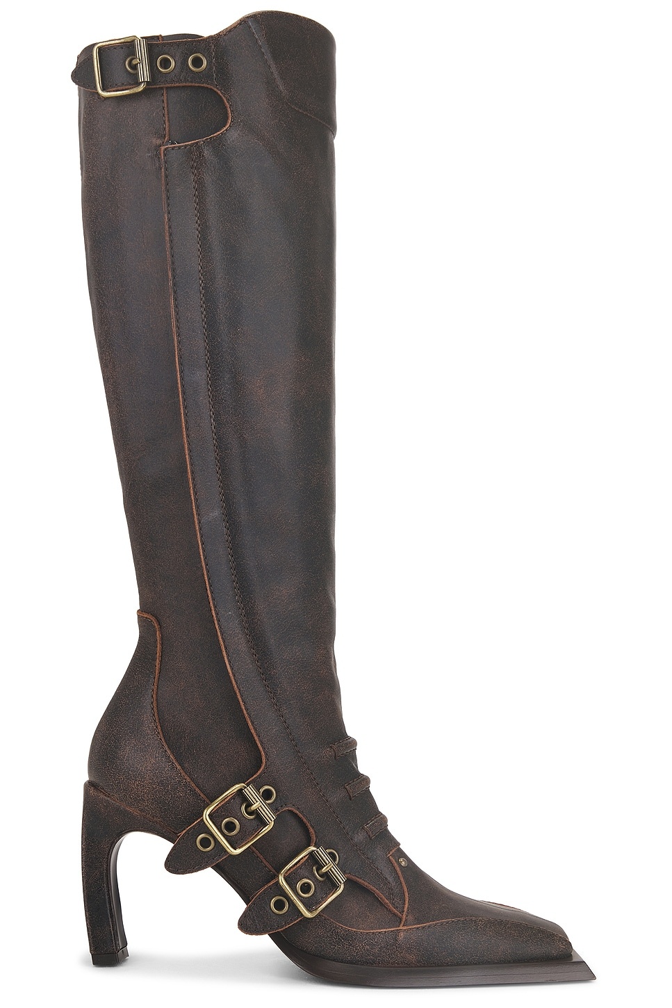 - Cowhide leather upper with leather sole - Made in Italy - Side zipper closure with adjustable buckled strap at shaft - Leather footbed and lining - Square toe with subtly curved heel - Approx 90mm/ 3.5 inch heel Approx 375mm/ 14.75 inch shaft Shaft measures approx 14.13" in circumference - Revolve Style No. KNLR-WZ1 - Manufacturer Style No. SS25-HELZBBO0BR