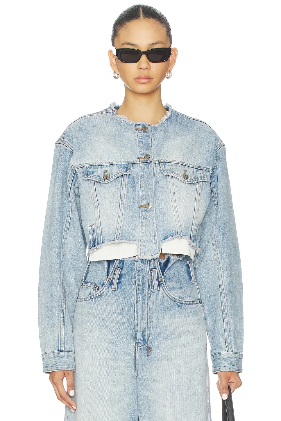 - 100% cotton - Machine wash - Made in China - Front button closure - Chest flap pockets - Non-stretch denim - Raw edge details at collar and waist - Buttoned cuffs - Revolve Style No. KSUB-WO5 - Manufacturer Style No. WPS26JK005