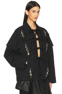 - Self: 64% polyester 34% viscose 2% lycra Lining: 100% cotton - Machine wash cold - Front tie closures and tonal belt at hem - Front flap pockets and welt pockets - Flap pockets at sleeves - Silver-toned metal locks and hardware details at front - Midweight twill fabric - Revolve Style No. LBOK-WO14 - Manufacturer Style No. LBSS25JCPVBK02