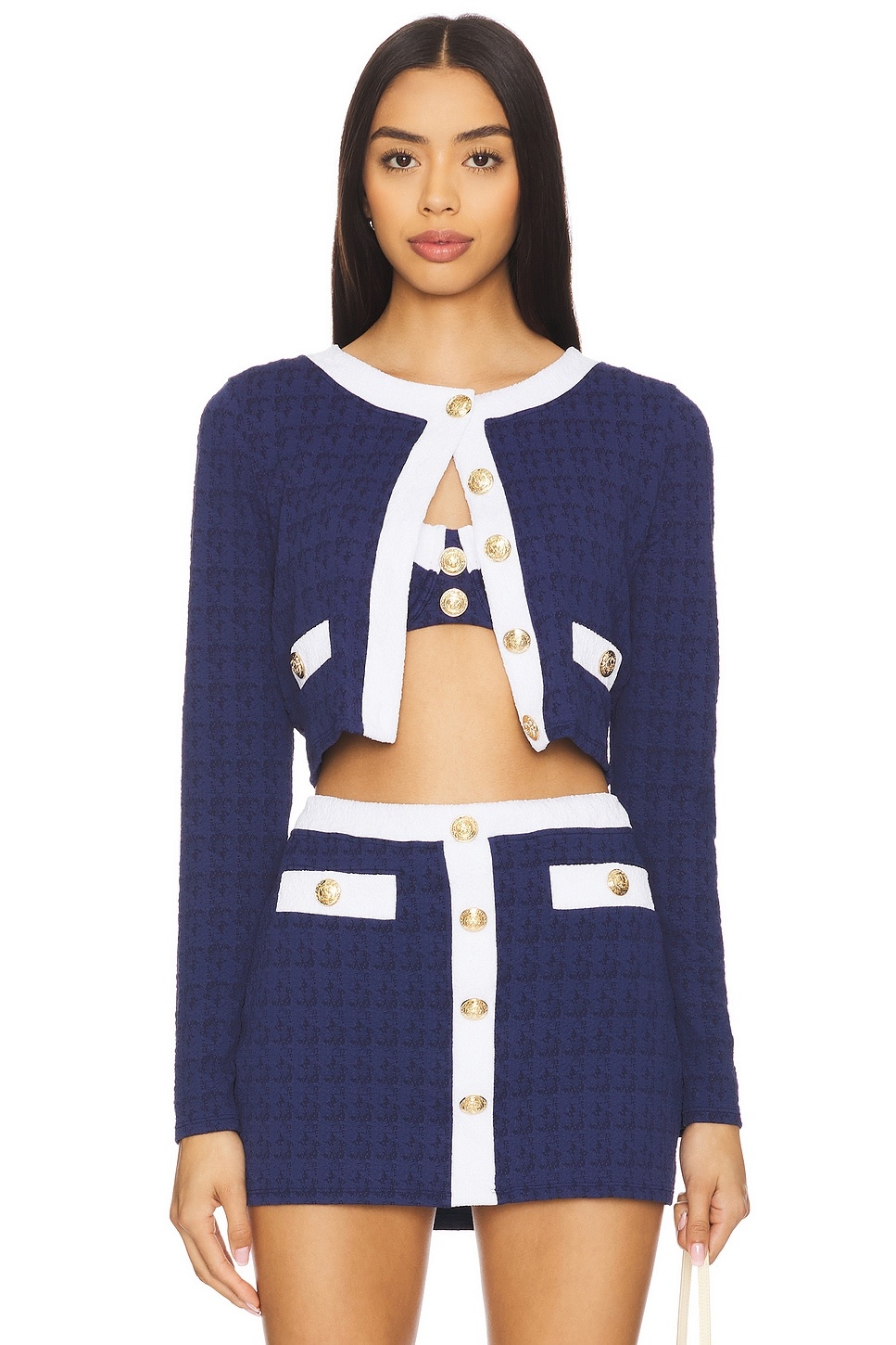 - Self 1: 93% nylon 7% elastane Self 2: 94% polyester 6% elastane - Made in China - Hand wash cold - Front gold-tone button closure - Front slip pockets - Textured crepe fabric - Item not sold as a set - Revolve Style No. LAGR-WK140 - Manufacturer Style No. LG5AM52