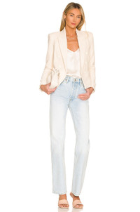 - 90% cotton 10% poly - Made in China - Dry clean only - Open front with faux button trim - Padded shoulders with buttoned cuffs - Welt pockets at breast and sides - Tweed fabric - Revolve Style No. LAGR-WO111 - Manufacturer Style No. 1626FQP