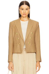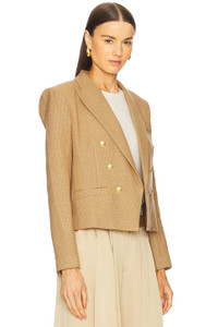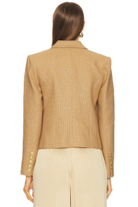 - Self: 80% cotton 18% polyester 1% metallic fiber 1% nylon Lining: 100% polyester - Made in China - Dry clean only - Double breasted closure.3-pocket design - Buttoned cuffs - Midweight twill fabric with metallic threading and padded shoulders - Revolve Style No. LAGR-WO272 - Manufacturer Style No. 1626CNQ