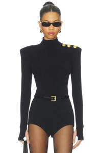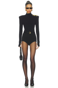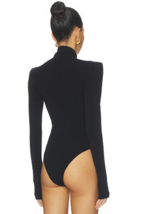 - 55% rayon 43% nylon 2% spandex - Made in China - Dry clean only - Pull-on styling and snap button gusset closure - Shoulder pads - Gold button detail on shoulder - Turtle neck - Thumbhole cuffs - Revolve Style No. LAGR-WS605 - Manufacturer Style No. 80147NXC2