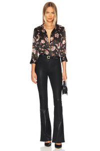 - 86% cotton 11% elastane 3% spandex - Made in USA - Spot clean only - Zip fly with button closure - Front faux seam pockets - Back slip pockets - Glossy coated denim fabric.12" at the knee breaks to 16" at the leg opening - Revolve Style No. LAGR-WJ192 - Manufacturer Style No. 2707PDDC