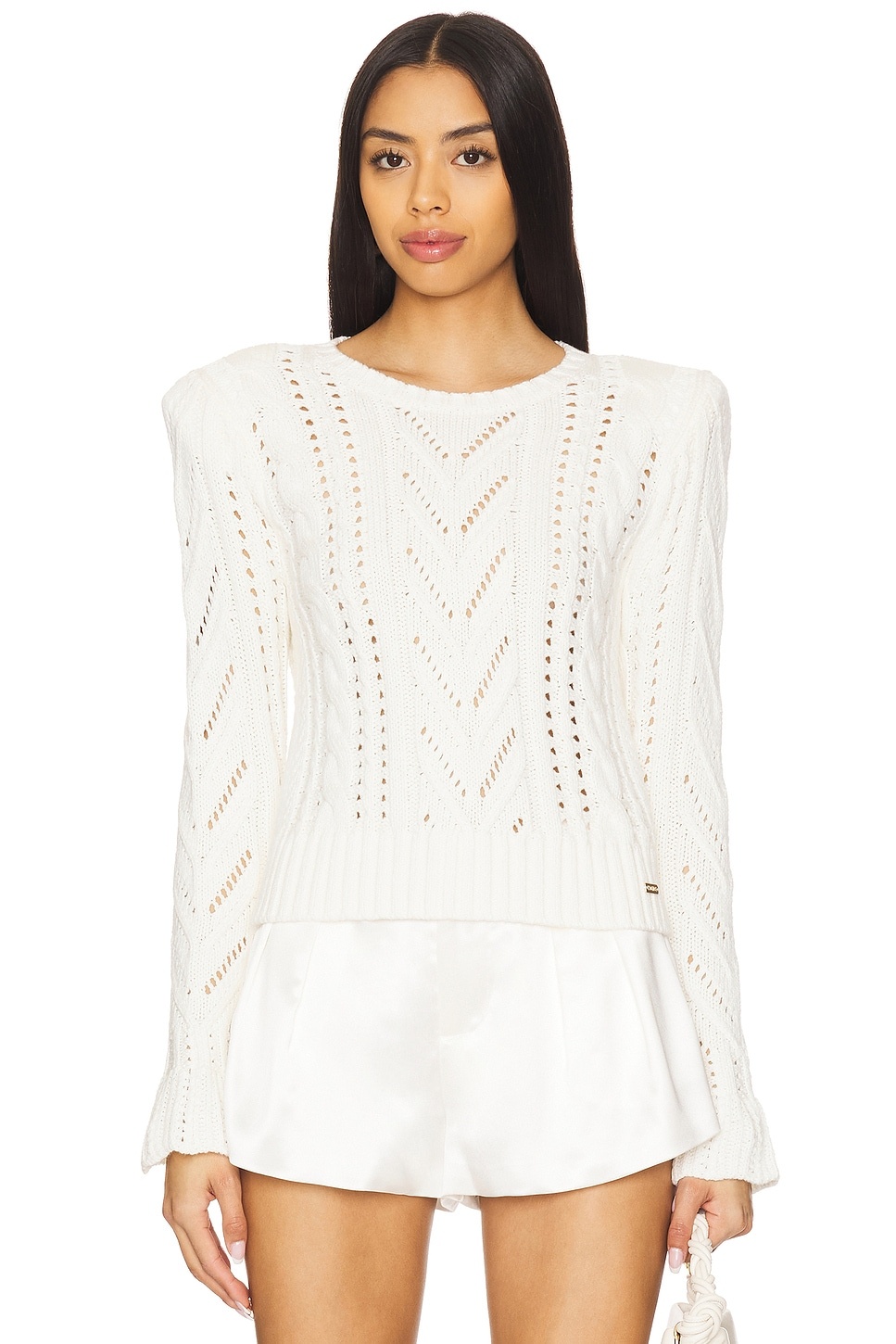 - 70% cotton 20% nylon 10% silk - Made in China - Dry clean only - Ribbed trim and padded shoulders - Heavyweight knit fabric Garment is made with a semi-sheer fabric, undergarments can show through - Revolve Style No. LAGR-WK138 - Manufacturer Style No. 80064PSN