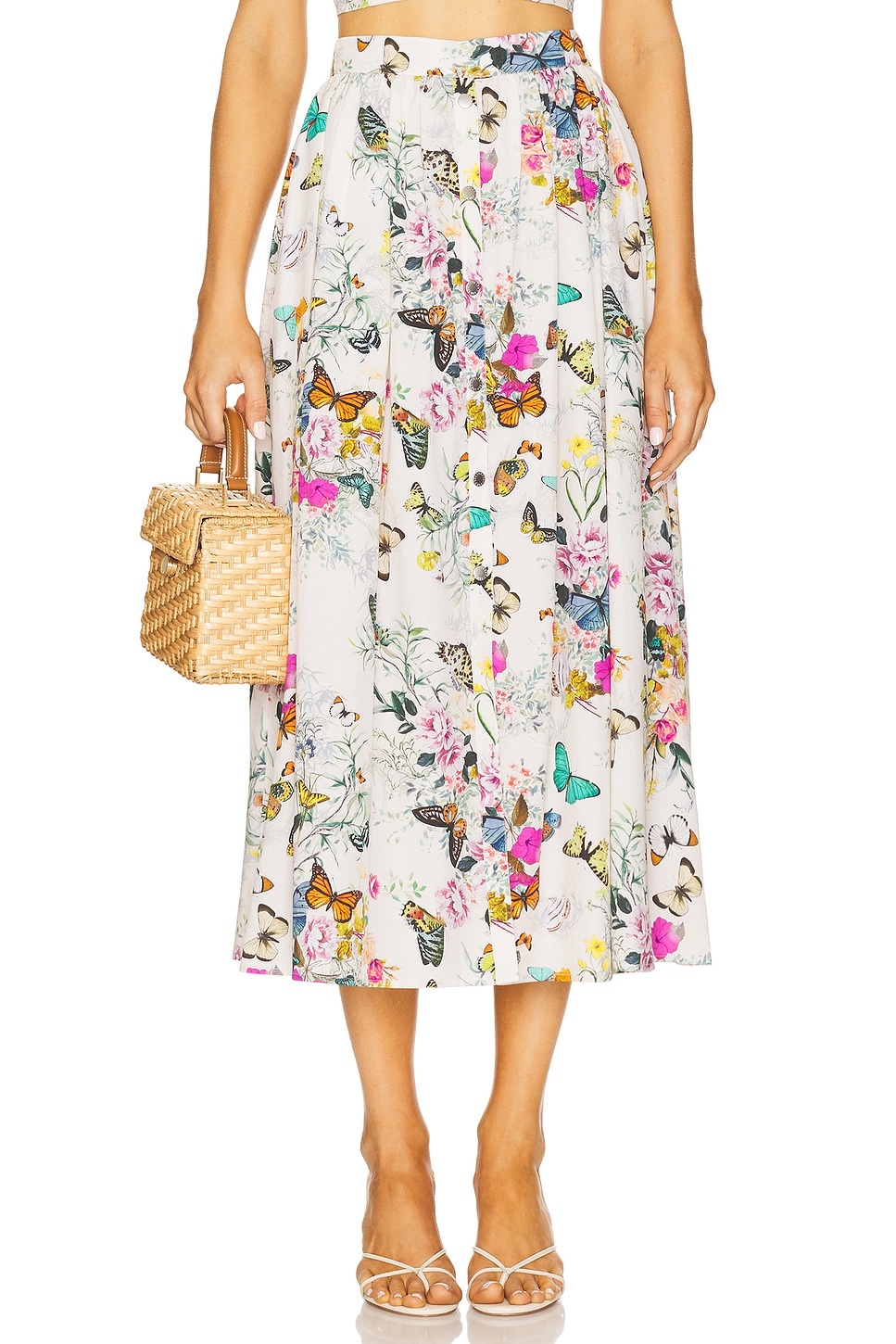 - 62.2% lyocell 37.8% cotton - Machine wash cold - Fully lined - Hidden side seam zipper closures - Front hem slit with snap button closures - Midweight poplin fabric with side seam pockets - Item not sold as set - Skirt measures approx 34.5" in length - Revolve Style No. LAGR-WQ60 - Manufacturer Style No. 3439FUC