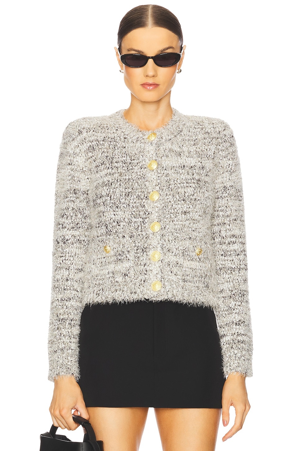 - 44% polyester 25% acrylic 15% cotton 11% nylon 4% lurex 1% spandex - Made in China - Dry clean only - Front gold-tone button closure - Front gold-tone button pockets and padded shoulders - Heavyweight knit fabric - Revolve Style No. LAGR-WK134 - Manufacturer Style No. 80045FZY