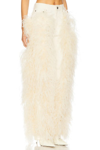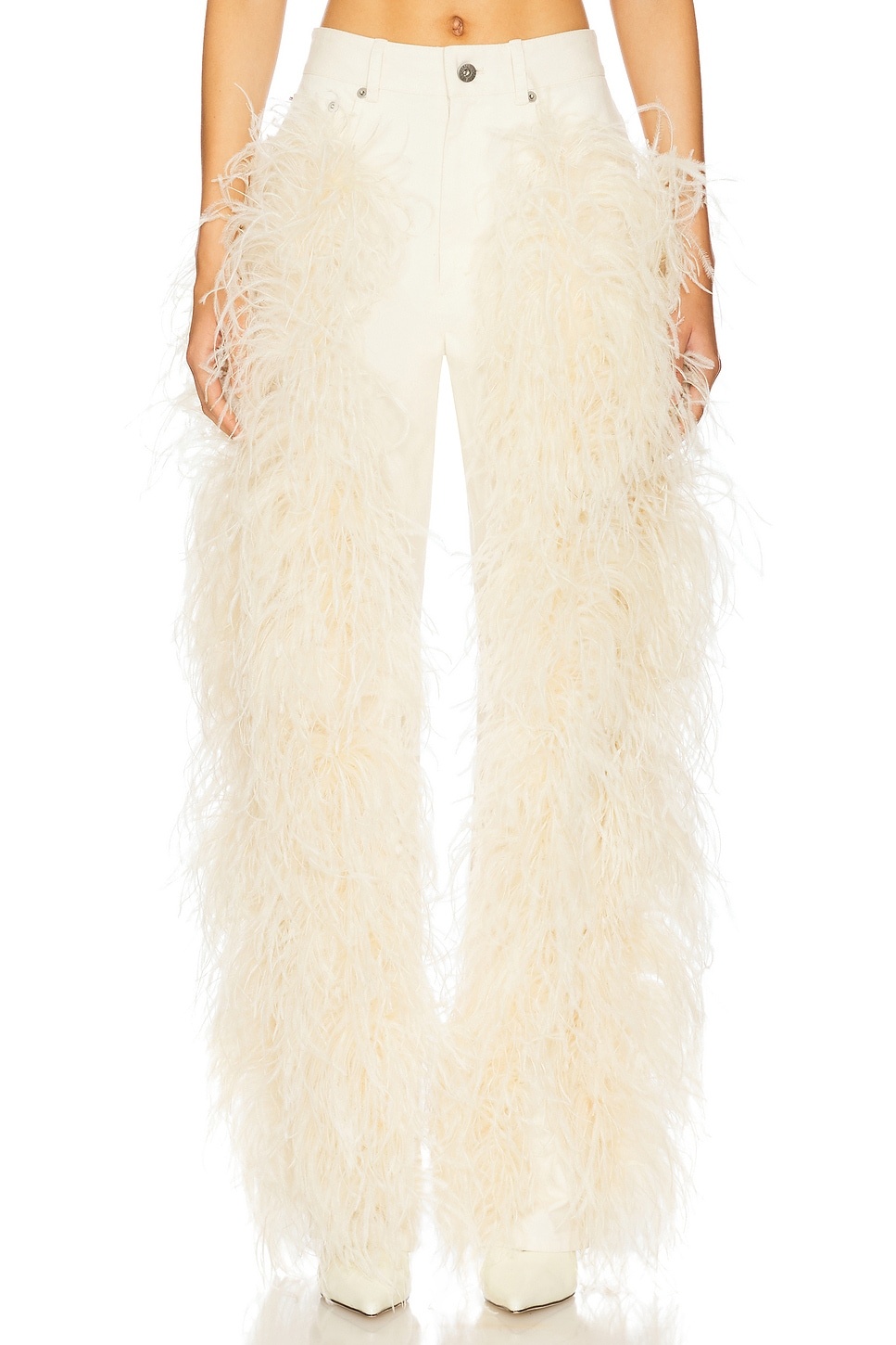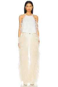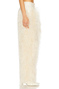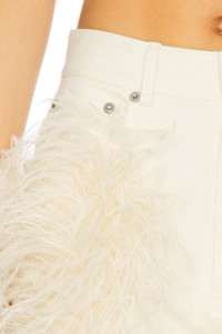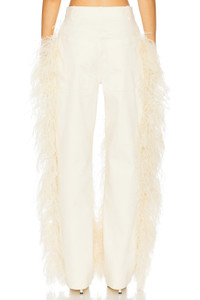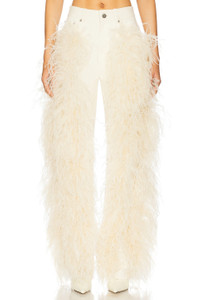 - Self: 98% cotton 2% elastane Contrast Fabric: 100% dyed ostrich feathers - Dry clean only - Zip fly with button closure.5-pocket styling - Ostrich feather trim - Midweight twill fabric - Item not sold as a set.18" at the knee narrows to 16" at the leg opening - Revolve Style No. LOIN-WP22 - Manufacturer Style No. R1257166ASA