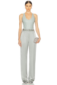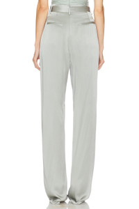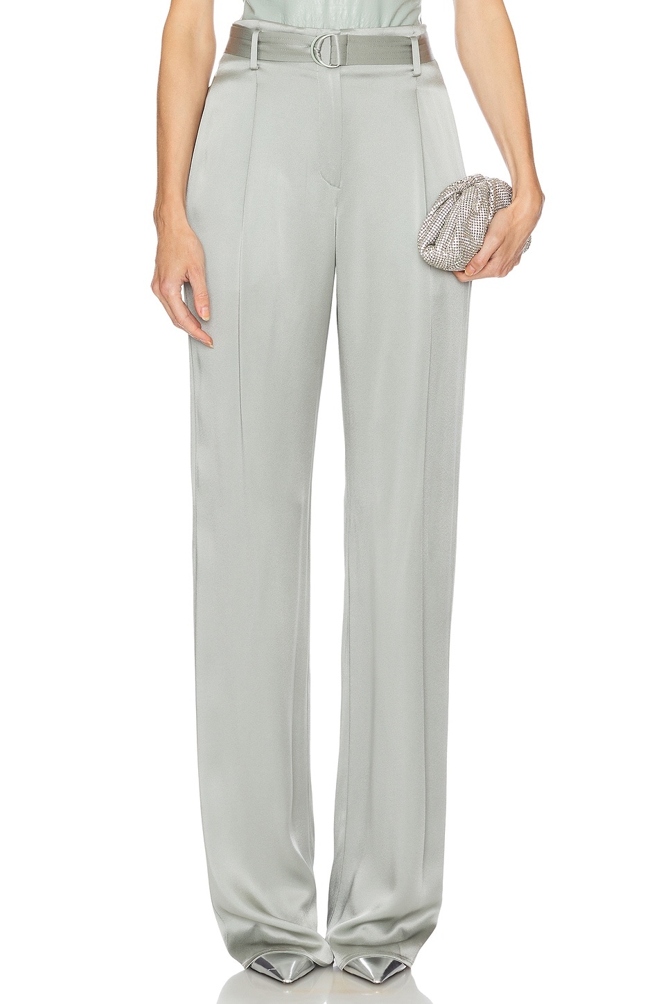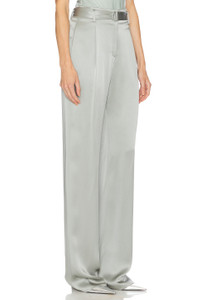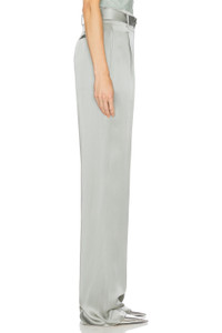 - 60% acetate 40% viscose - Made in USA - Dry clean only - Zip fly and clasp closure - Midweight satin fabric with removable tonal belt - Side seam pockets - Faux back welt pockets.16" at the knee breaks to 18" at the leg opening - Revolve Style No. LOIN-WP20 - Manufacturer Style No. R1257012OJA