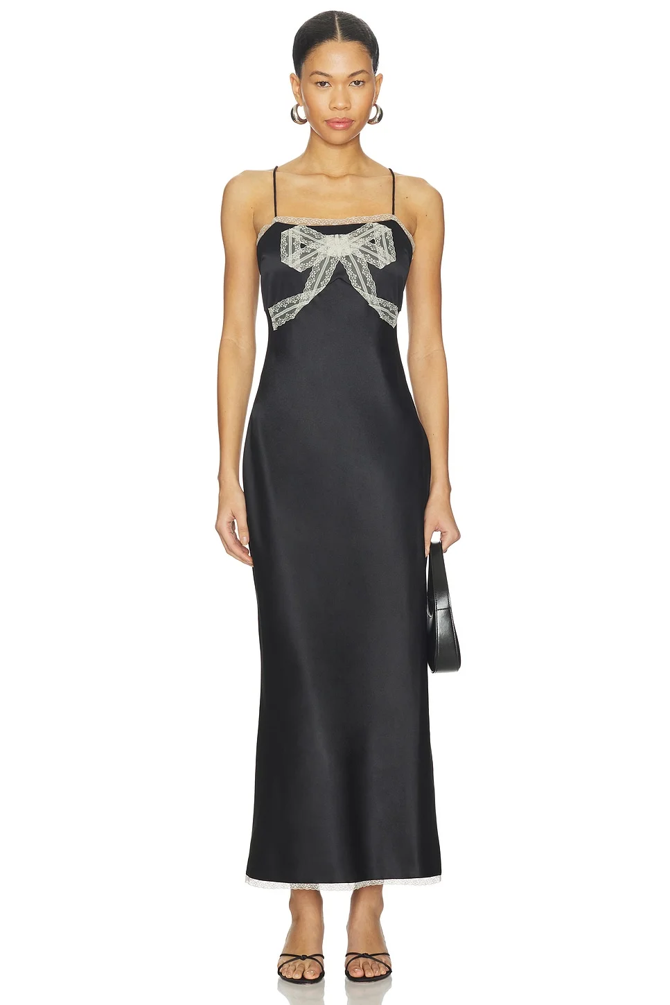 - 100% polyester - Made in India - Hand wash cold - Unlined - Hidden side zip with hook and eye closure - Lightweight satin-finish crepe with a charmeuse-like sheen - Front lace bow - Revolve Style No. LESH-WD961 - Manufacturer Style No. D2949-2976