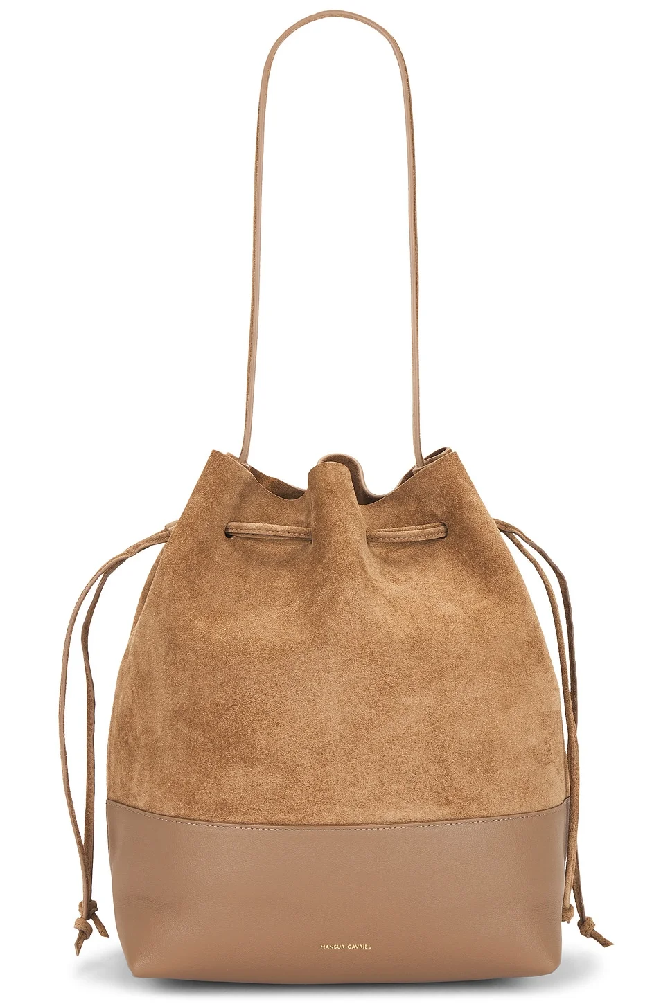 - Calf suede and leather exterior with calf leather lining - Top drawstring closure - One main compartment - Interior slip pocket - Integrated shoulder strap - Measures approx 10.2" W x 12.5" H x 6.7" D Shoulder strap with a 12.2" drop - Revolve Style No. MANR-WY89 - Manufacturer Style No. WF25H182WS