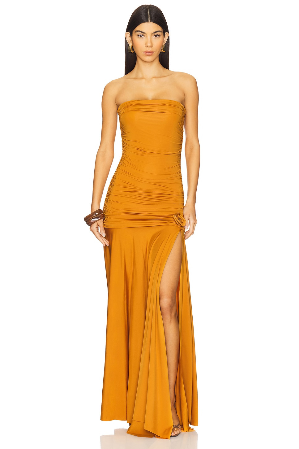 - 78% polyamide - Hand wash cold - Partially lined - Strapless design - Ruched seams - Drop waist design with rose detail - Midweight jersey fabric with side slit design - Neckline to shortest hem measures approx 21" and to longest hem approx 54" in length - Revolve Style No. MAYR-WD38 - Manufacturer Style No. VT-118-MY