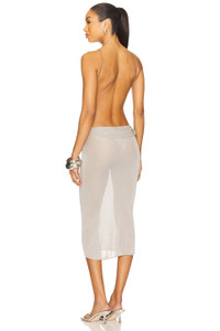 - 75% recycled viscose 25% nylon - Dry clean only - Unlined - Pull-on styling - Silver-tone chain shoulder straps - Lightweight knit fabric - Garment is intentionally sheer, undergarments will show through. - Revolve Style No. MAOU-WD95 - Manufacturer Style No. 5076MKTMSL