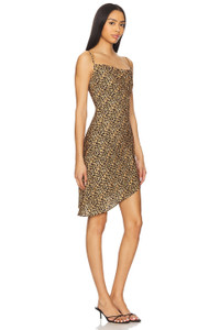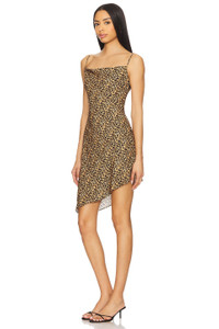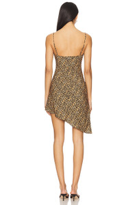 - 97% polyester 3% spandex - Made in China - Machine wash cold - Fully lined - Hidden side zip with hook and eye closure - Asymmetric hem - Leopard print crepe fabric with gold-tone logo detail at back - Revolve Style No. MAOU-WD80 - Manufacturer Style No. 5005CDCLEO
