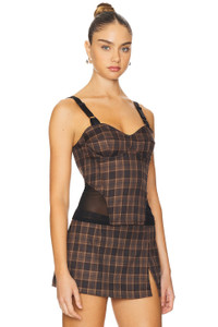 - Self: 98% Polyester 2% spandex Contrast: 70% nylon 30% spandex - Made in China - Dry clean - Back zipper closure - Corset design with boning on bodice - Adjustable straps Unpadded cups - Revolve Style No. MAOU-WS340 - Manufacturer Style No. 7149PLBPLB