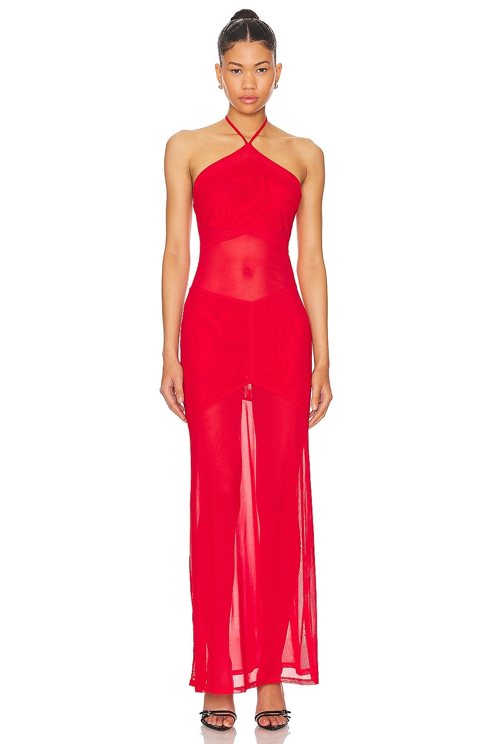 - 70% nylon 30% spandex - Made in China - Dry clean - Unlined - Hidden side zipper with halterneck tie closure - Revolve Style No. MAOU-WD69 - Manufacturer Style No. 5055PM3SCA