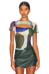 - 94% recycled polyester 6% lycra - Made in China - Green dry clean only - Back lace up tie closure - Front and back cut-out design - Lightweight mesh fabric with geometric design - Please note due to the nature of the pattern, slight differences and pattern will vary throughout each style - .The Miaou x Paloma Elsesser Lace Back Tee is a great day-to-night top that has an adjustable lace-up back. - Revolve Style No. MAOU-WS105 - Manufacturer Style No. 7053-CL-ABS-PM1