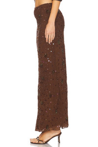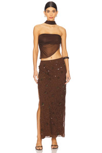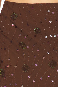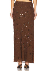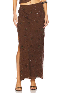 - Self & Lining: 100% silk - Spot clean only - Fully lined - Side button loop closure - Embroidered sequin and beaded detailing - Midweight charmeuse fabric - Item not sold as a set - Waist to shortest hem measures approx 14.5" and to longest hem approx 40" in length - Revolve Style No. MPAL-WQ7 - Manufacturer Style No. MP5021