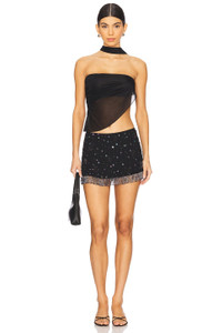 - Self & Lining: 100% silk - Spot clean only - Fully lined - Side button loop closure - Beaded fringe hem - Embroidered sequin and beaded detailing - Midweight charmeuse fabric - Waist to shortest hem measures approx 5.5" and to longest hem approx 12" in length - Revolve Style No. MPAL-WQ6 - Manufacturer Style No. MP5019