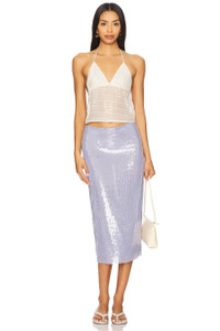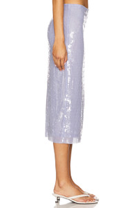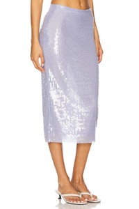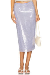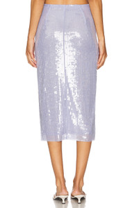 - 97% polyester 3% spandex - Dry clean only - Fully lined - Concealed side zipper with hook and eye closure - Midweight sequin-embellished fabric - Skirt measures approx 29" in length - Revolve Style No. MONS-WQ14 - Manufacturer Style No. MS250608SQM