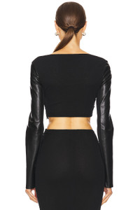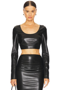- Self 1: 100% polyurethane Self 2: 100% polyester Lining: 100% polyester - Made in China - Dry clean - Hidden side zipper closure - Scoop -neck design - Faux leather fabric at front with slinky knit contrast at back - Item not sold as set - Revolve Style No. NUSH-WS86 - Manufacturer Style No. NW24PFTP15615