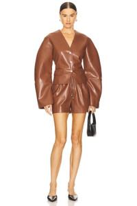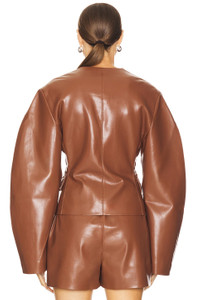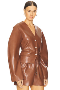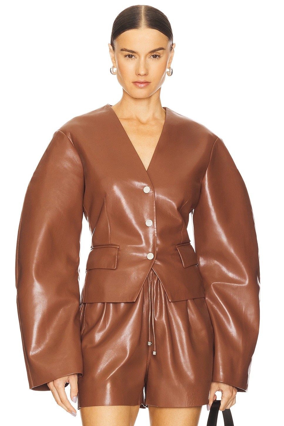 - Self: 100% polyurethane Lining: 100% recycled polyester - Dry clean only - Front snap button closure - Flap pockets - Rounded sleeves - Midweight faux leather - Item not sold as a set - Revolve Style No. NUSH-WO25 - Manufacturer Style No. NW25SSOW22075